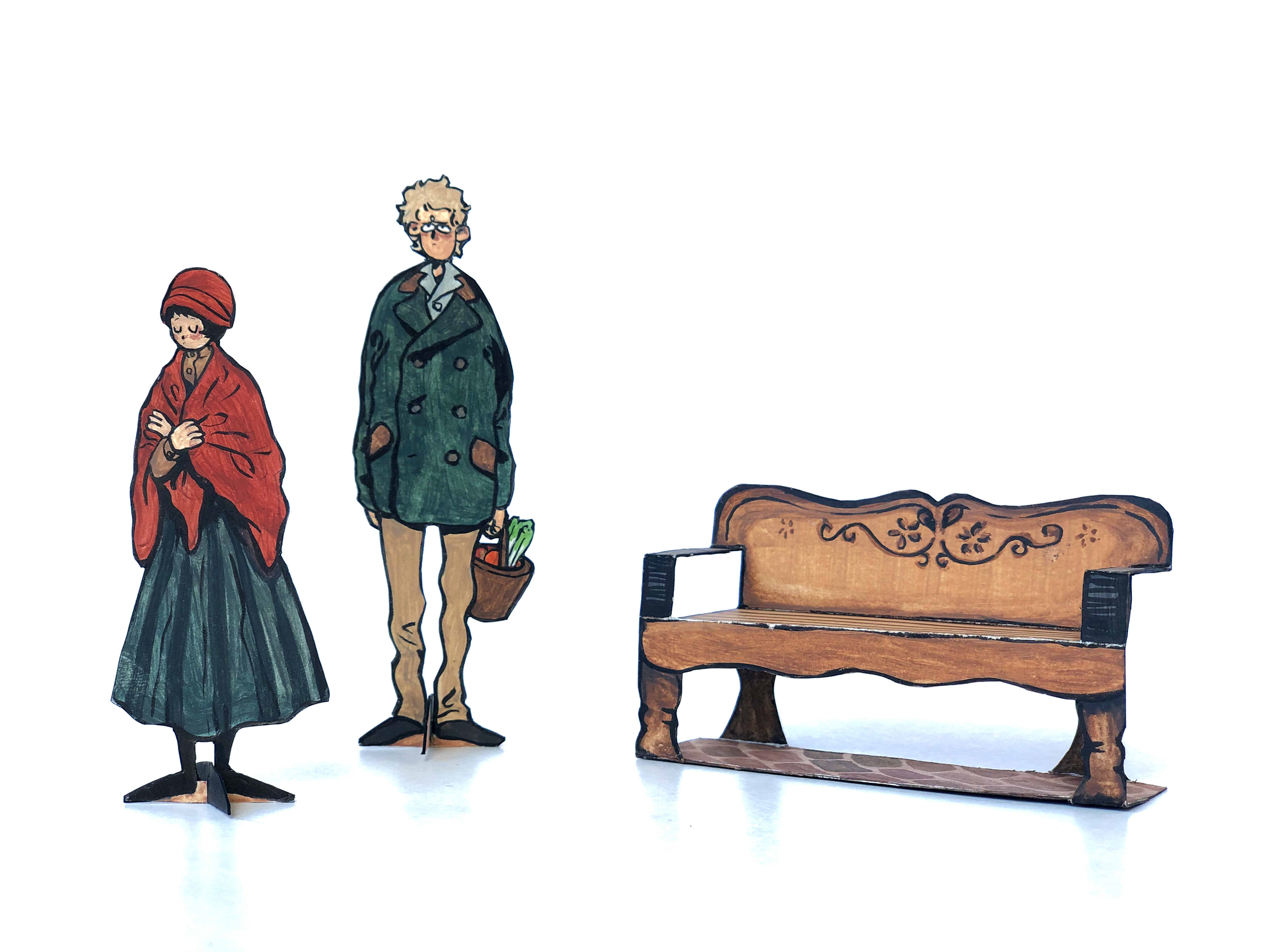 At the Flea Market is a pop-up book with a single folding structure. The two characters, Fabienne and Meritte are from the original story: The Fabulous World. The scene in the illustration is transformed into a pop-up structure. In this piece, except the wall and booth, the characters and the bench are movable so that the audience is able to arrange the scene as they want.