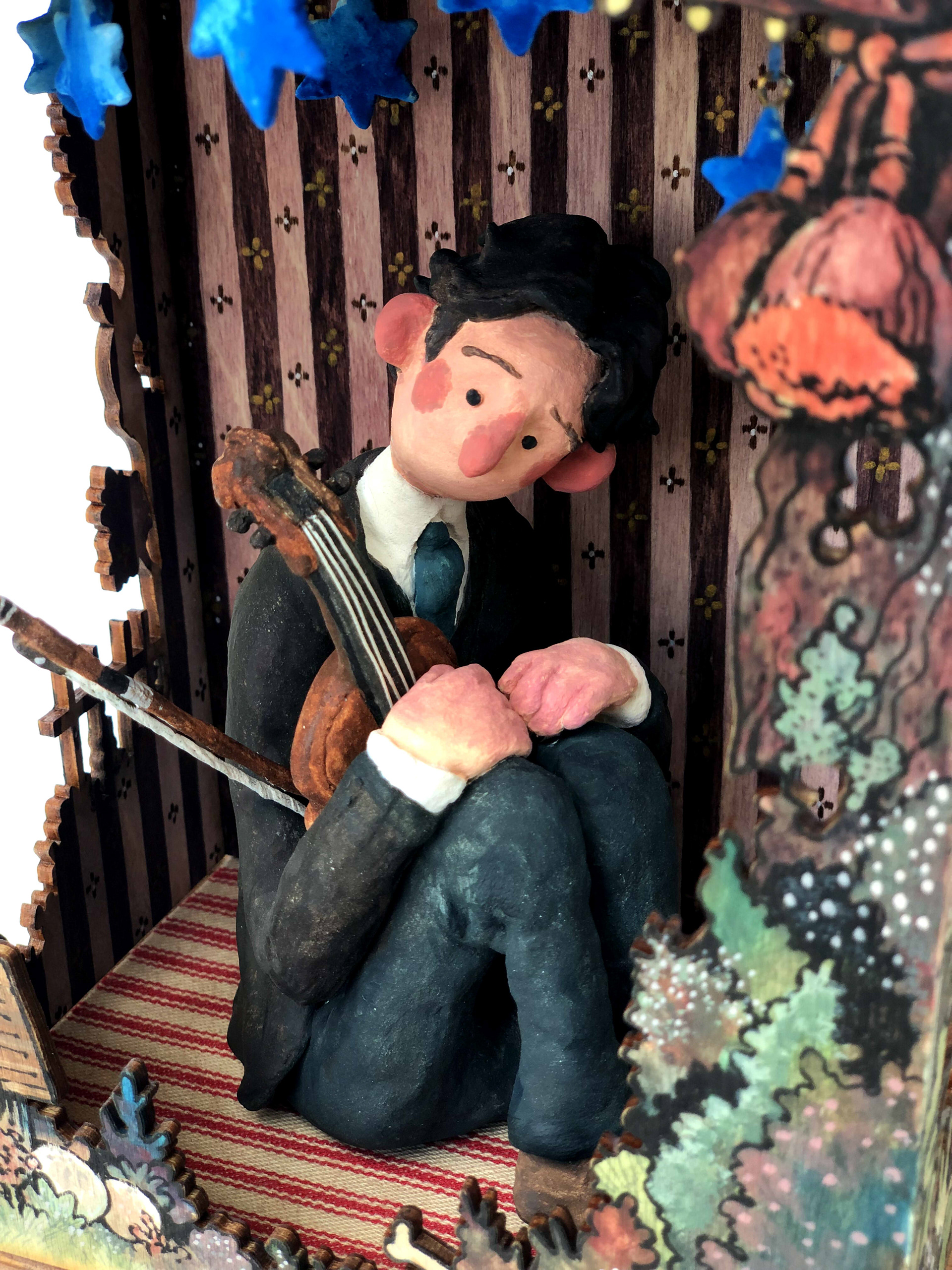 Shawn’s Music Box (rhythm: La vie en rose) combines the technique of automaton, wood cutting and sculpture. Shawn is one of the characters in the story: the Fabulous World. On the facade of the doll house made by laser cut technique, ruins of the war and wild plants are depicted. The blue star of David hanging over him symbolize his Jewish identity; he crumbles on the floor, holding a violin in his arms and stares at the audience, as if he is asking for help and comfort.