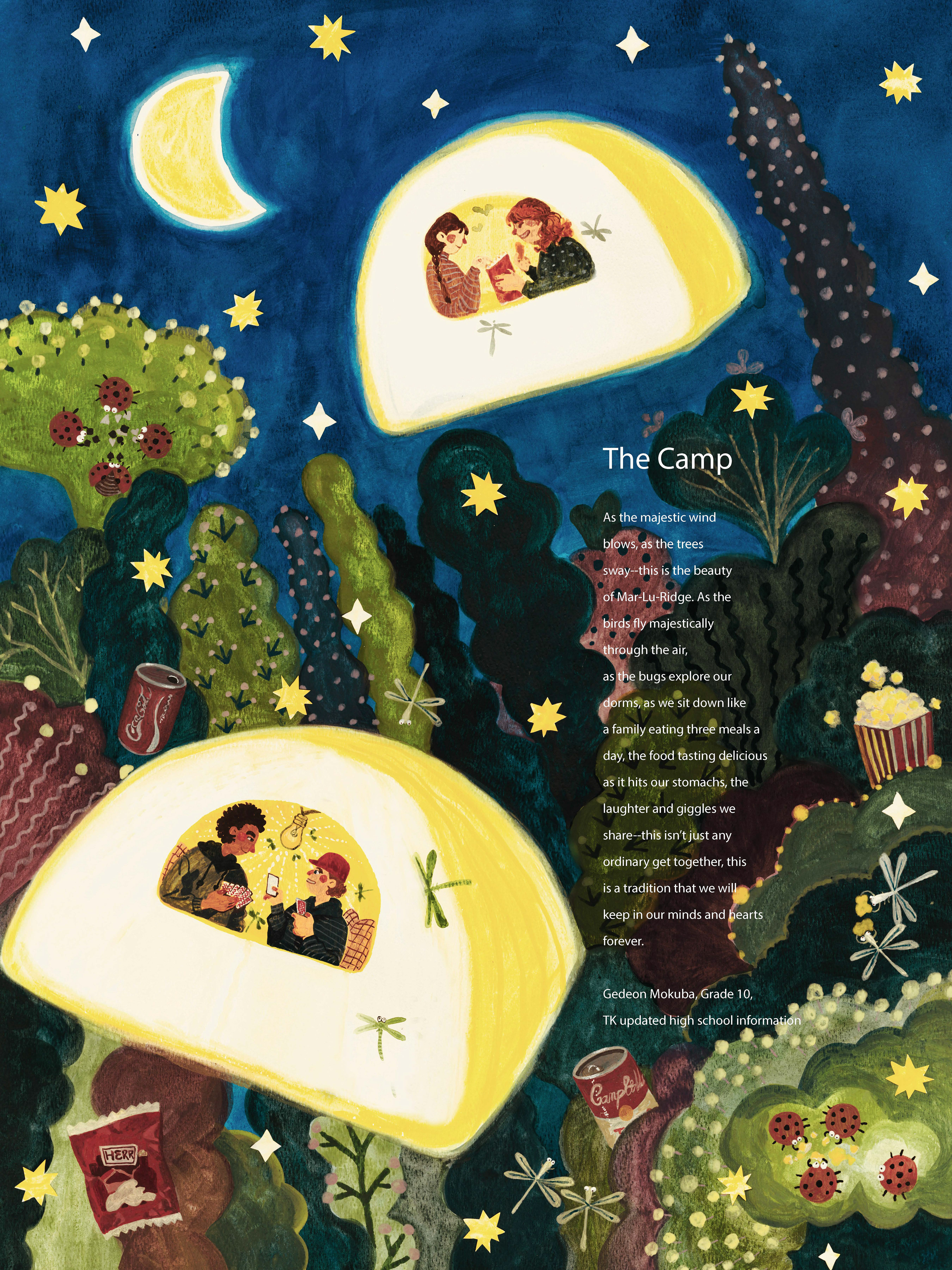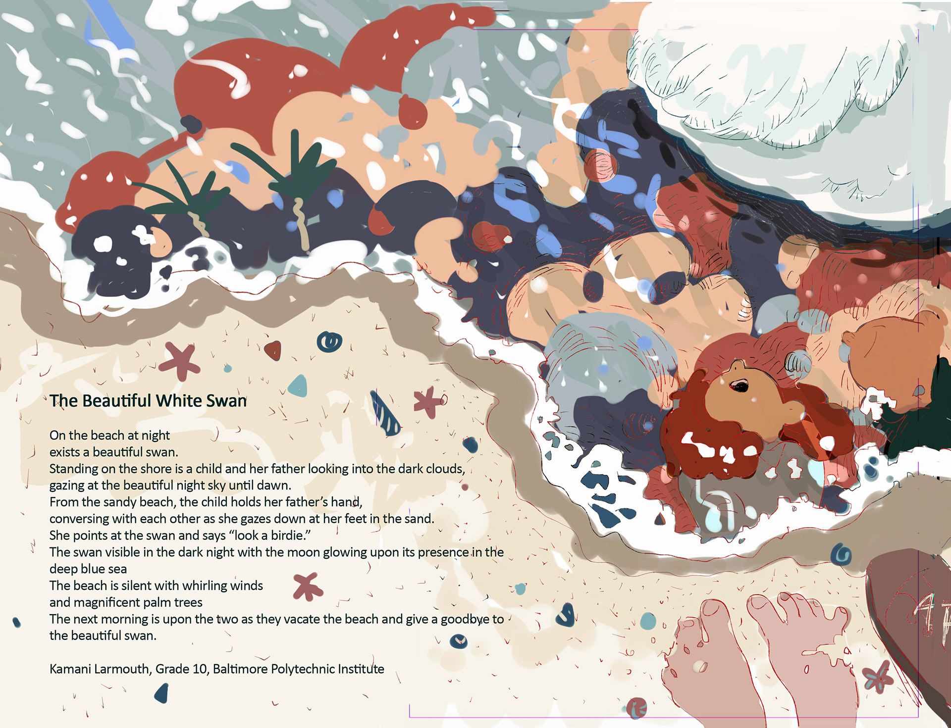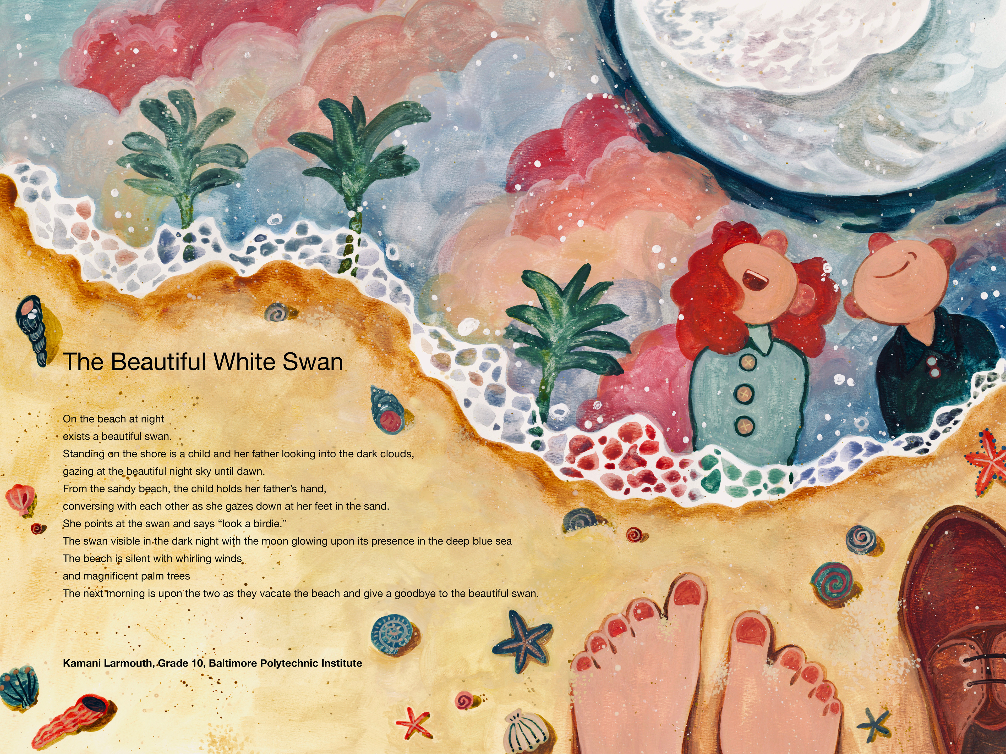 The poems: The Beautiful White Swan and The Camp were illustrated by Chendi. She applied new materials in order to push herself further and develop new styles. The two poems are both gentle and peaceful, so she used gouache and watercolor to depict the calmness and beauty.