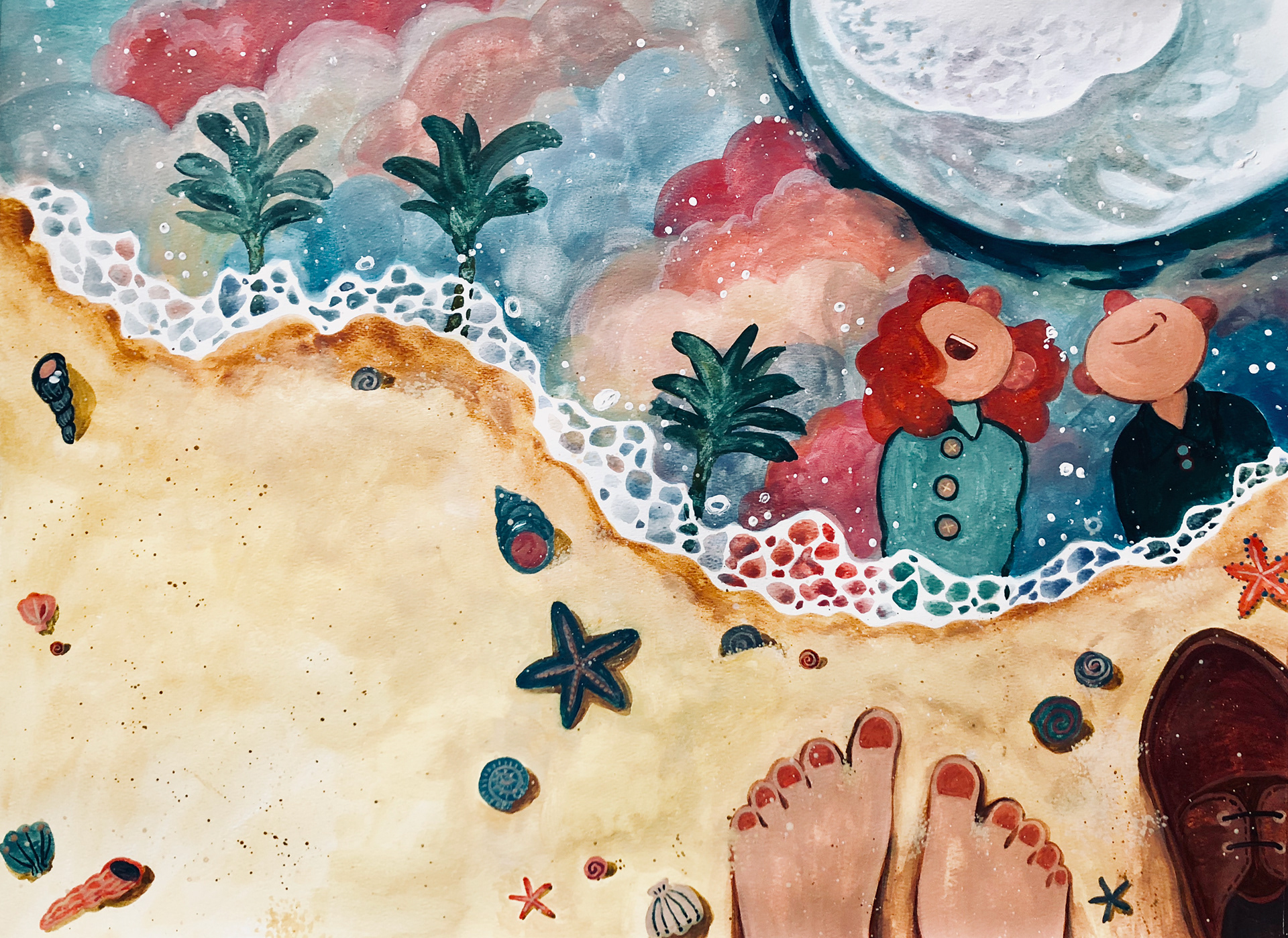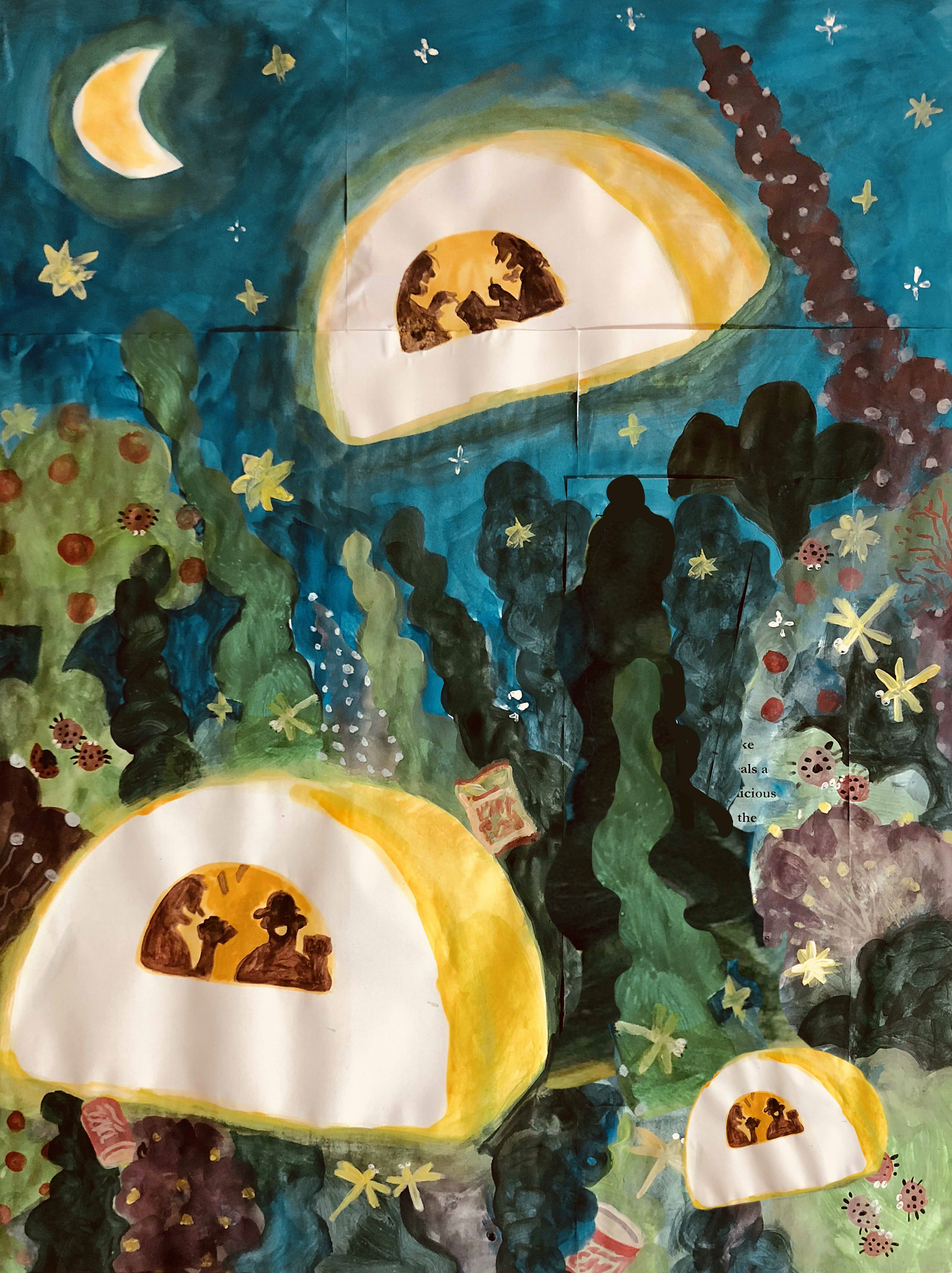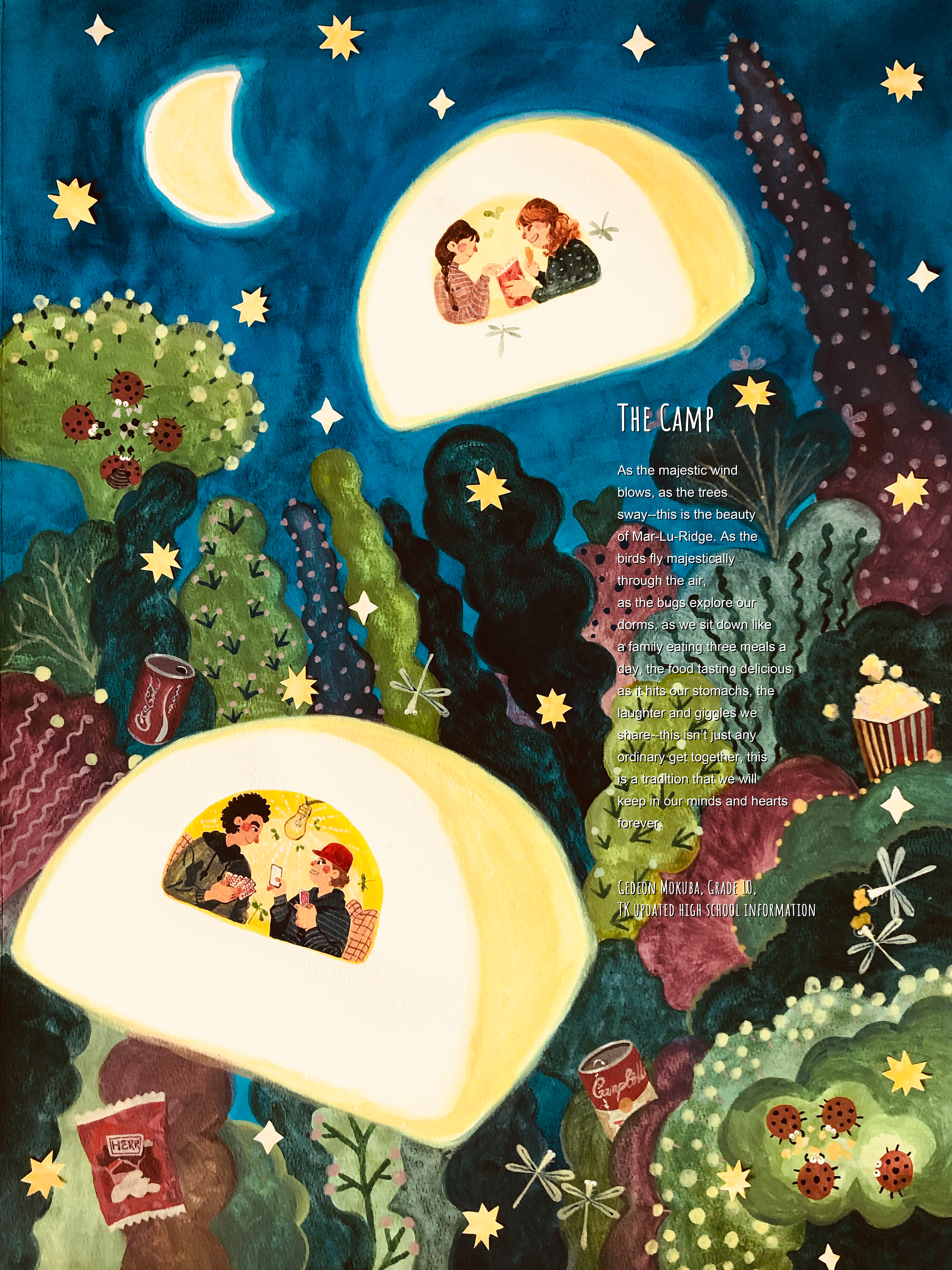 The poems: The Beautiful White Swan and The Camp were illustrated by Chendi. She applied new materials in order to push herself further and develop new styles. The two poems are both gentle and peaceful, so she used gouache and watercolor to depict the calmness and beauty.